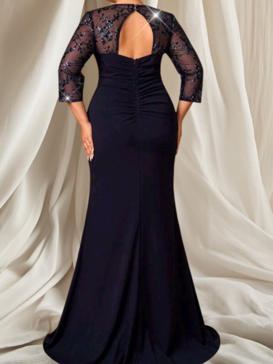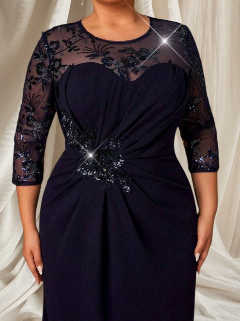 Elegante donkerblauwe avondjurk in maat 48, ideaal voor gala, bruiloft of een chique avond. Deze verleidelijke plus size avondjurk heeft luxe kanten mouwen, subtiele glansdetails en een flatterende pasvorm die de taille prachtig accentueert. Perfect voor vrouwen met maat 48 die zoeken naar een stijlvolle, betaalbare grote maten avondjurk met een elegante uitstraling.